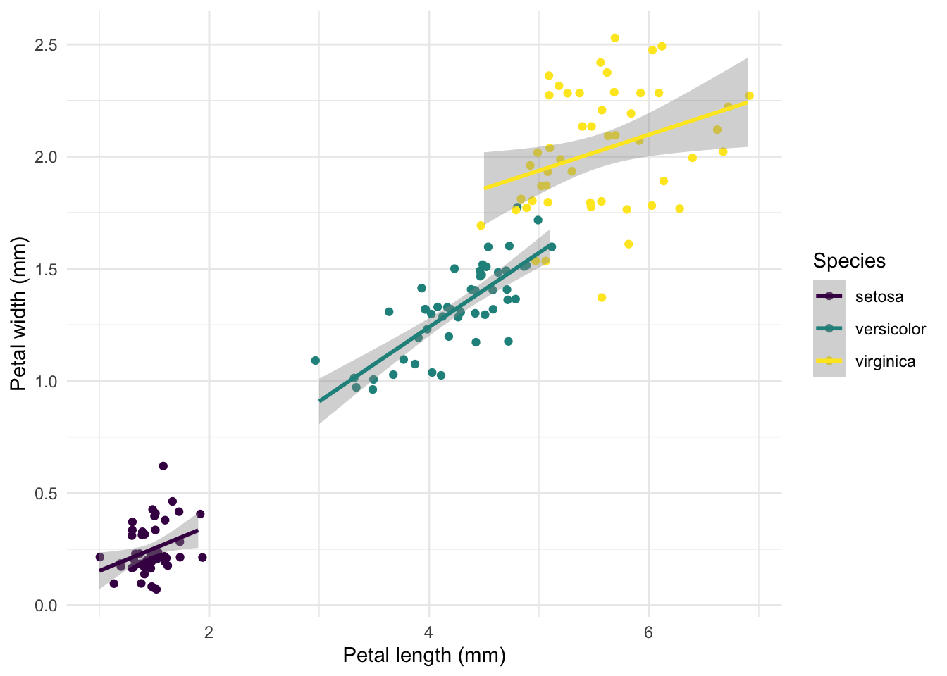 # a quick graph using ggplot2# initialize using our datasetggplot(iris2) +# define axes and columns to displayaes(pl, pw, col=sp) +# draw points, slightly jittered to show all 150 pointsgeom_jitter() +# let's add a linear model smoothgeom_smooth(method="lm", formula="y~x") +# here we tune coloursscale_color_viridis_d() +# and add more cosmeticsguides(colour=guide_legend("Species")) +xlab("Petal length (mm)") +ylab("Petal width (mm)") +# we love both cosmetics and minimal designtheme_minimal()