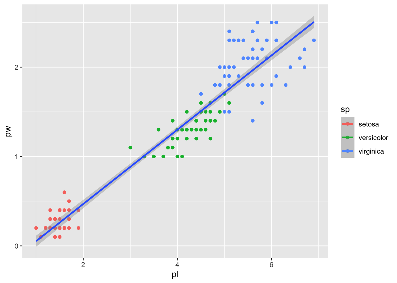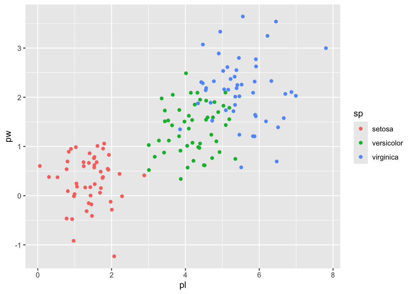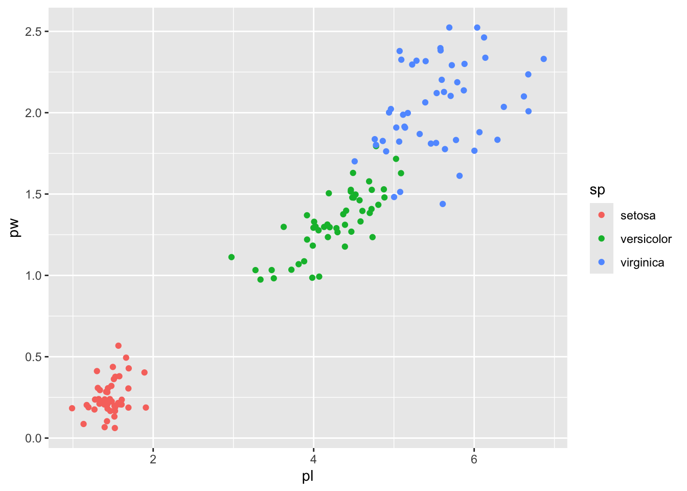 <- ggplot(iris2) + aes(pl, pw, col=sp) + geom_point()