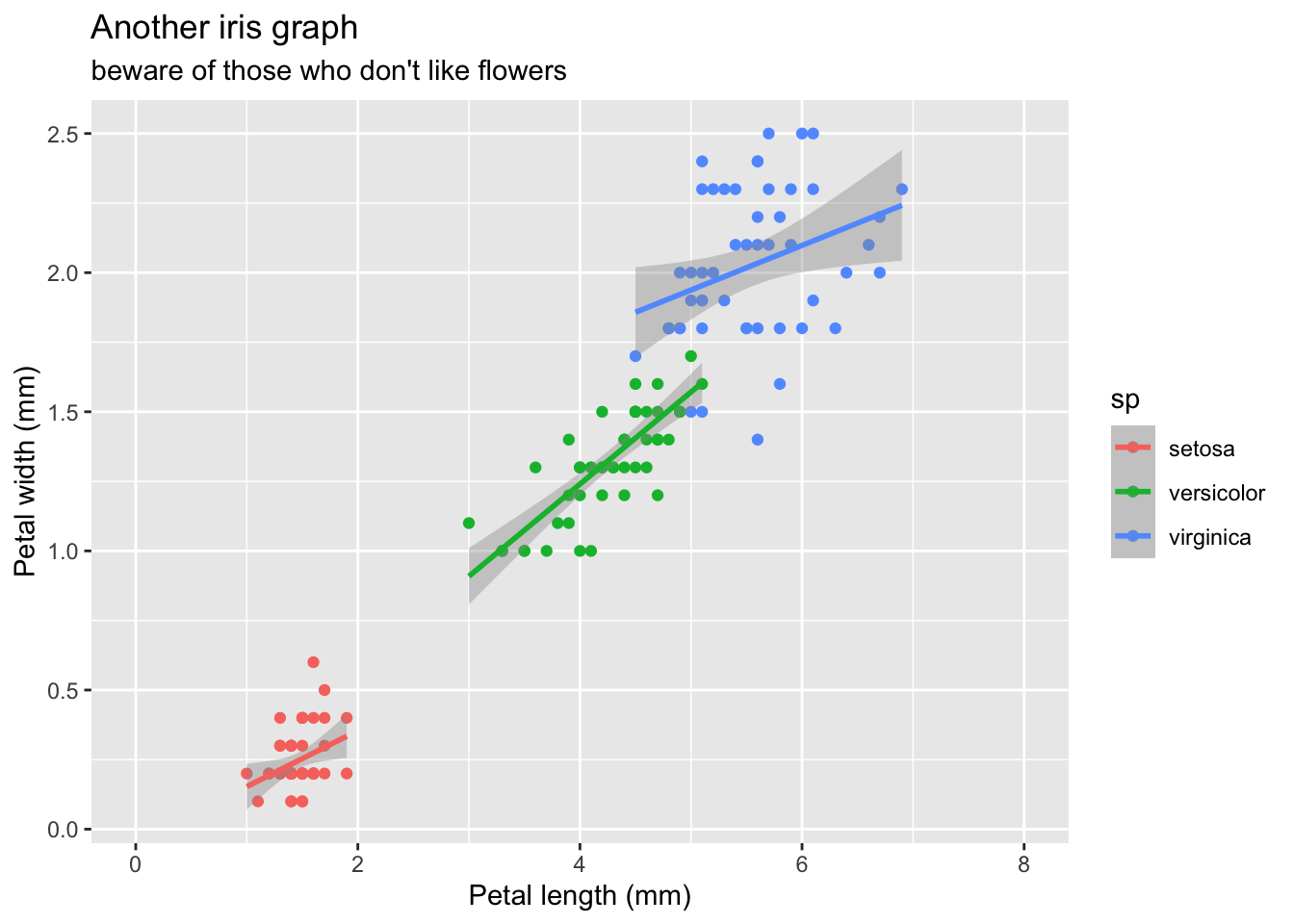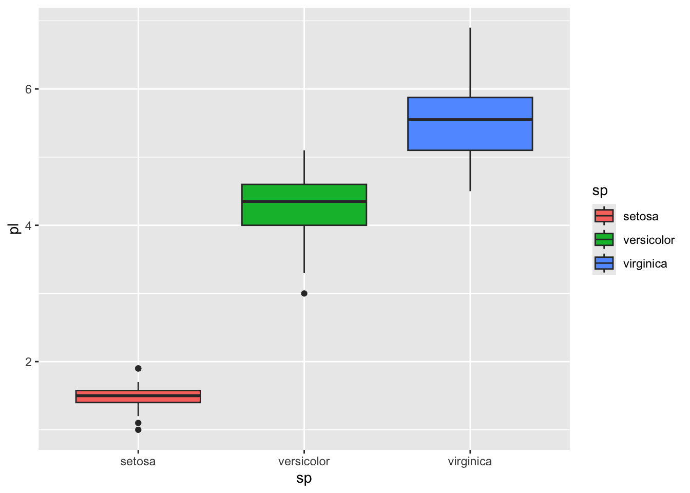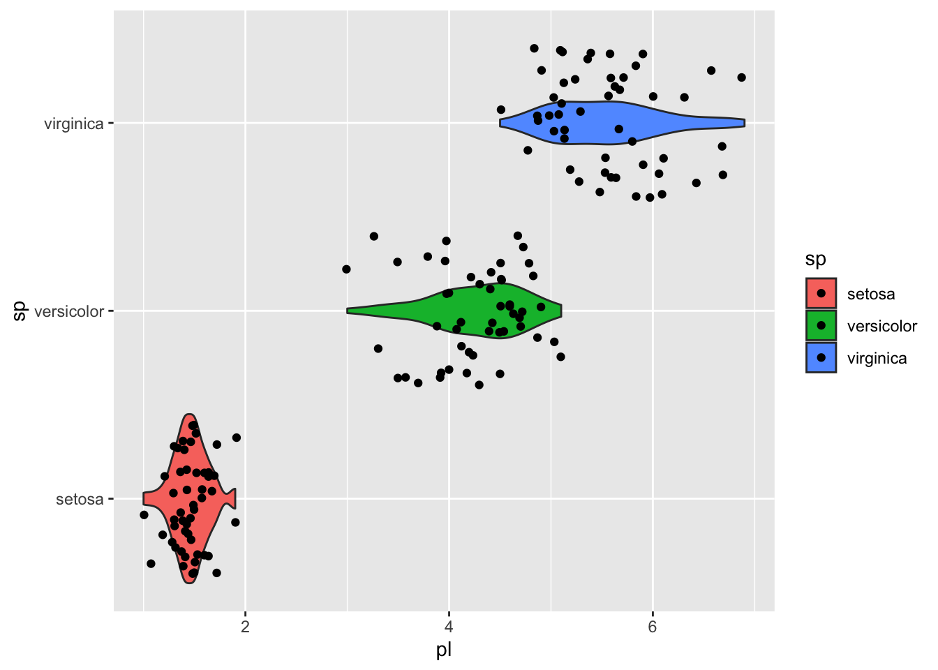 <- ggplot(iris2) + aes(pl, pw, col=sp) + geom_point()