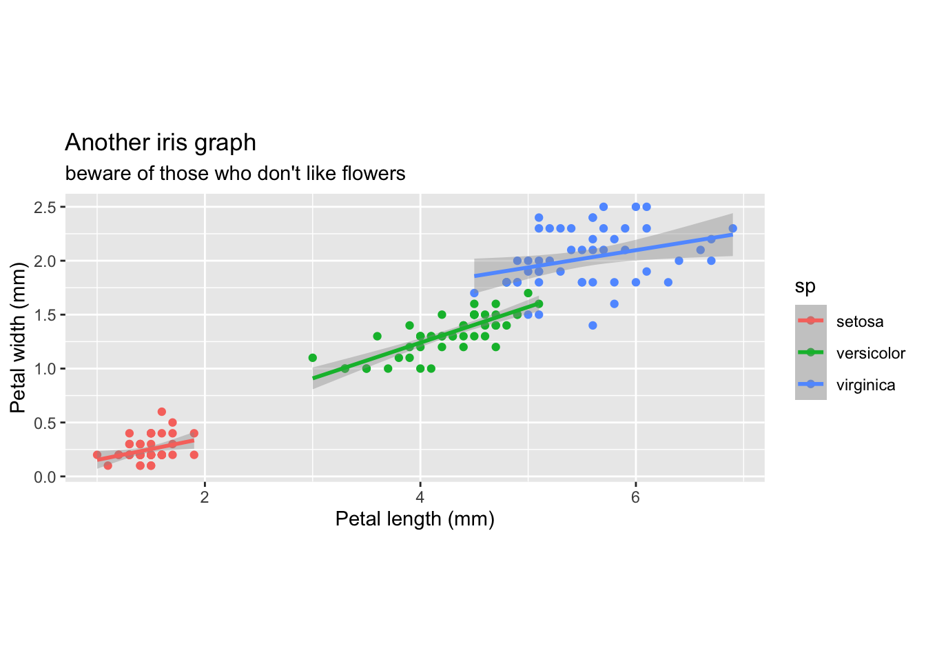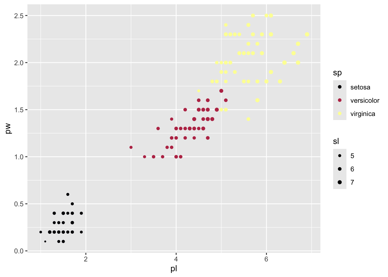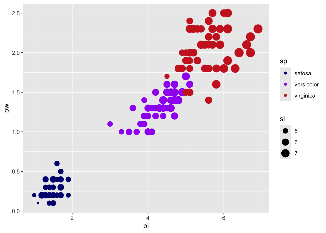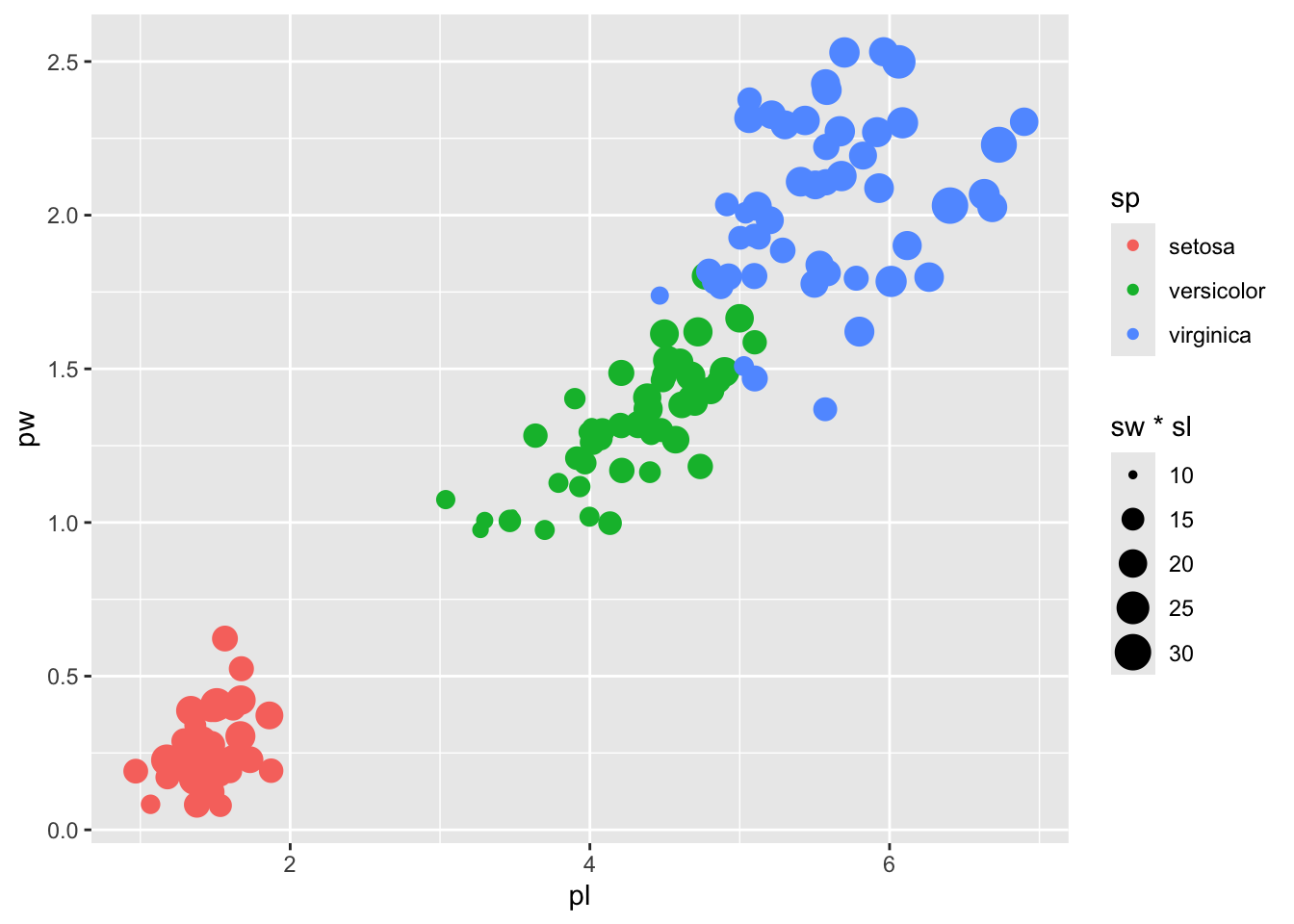 <- iris2 %>% ggplot() + aes(pl, pw, col=sp, size=sl) + geom_point()