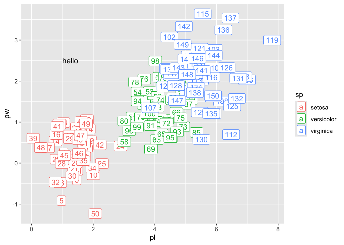 annotate("text", x=1, y=2.5, label="hello", hjust=0)