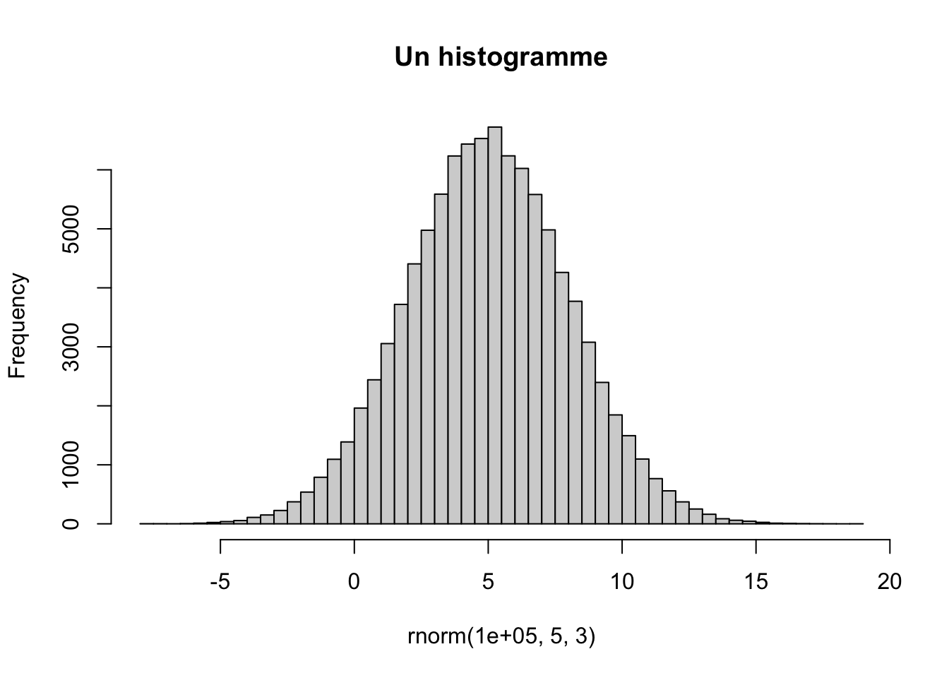 hist(rnorm(1e5, 5, 3), breaks=50, main="Un histogramme")