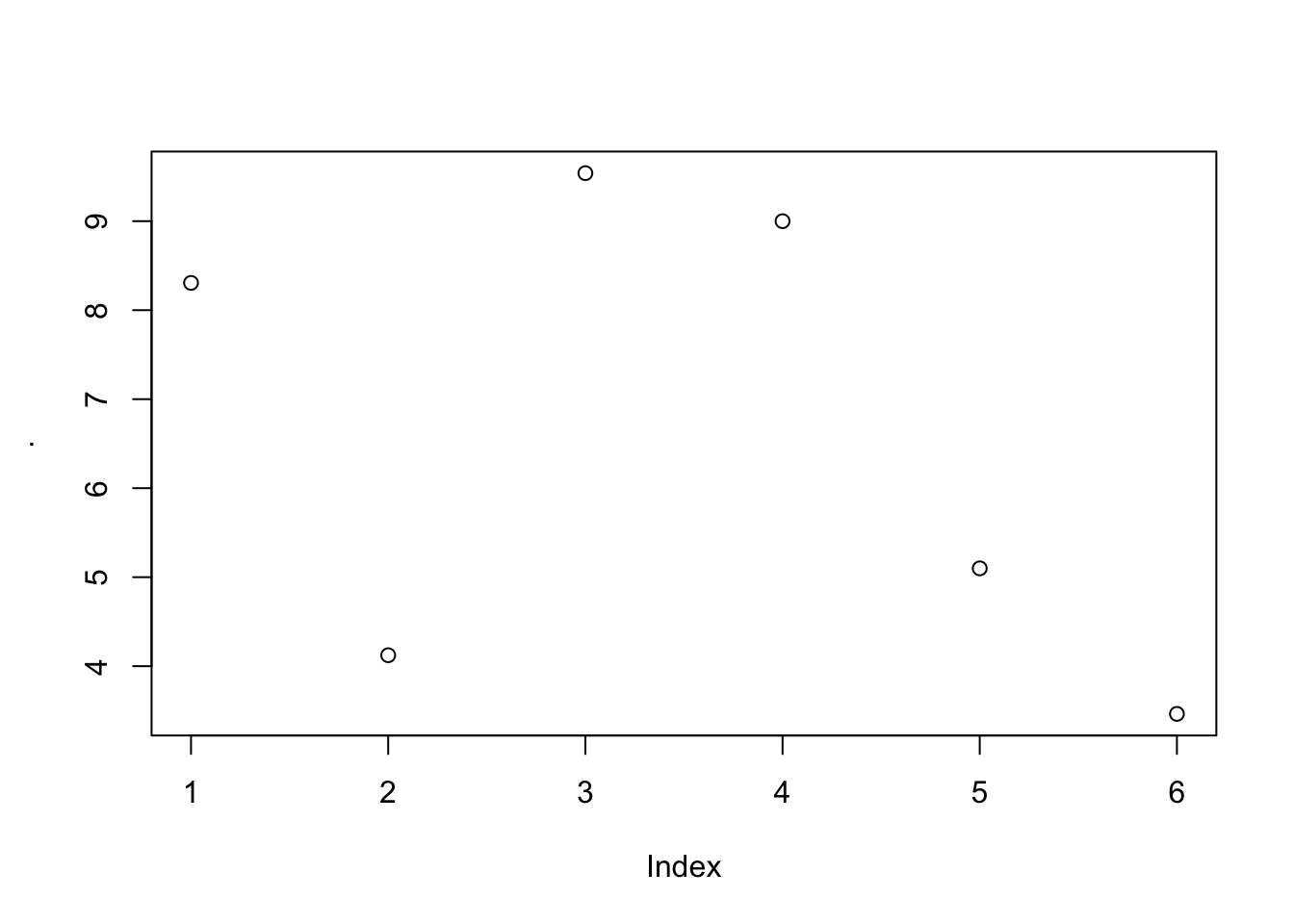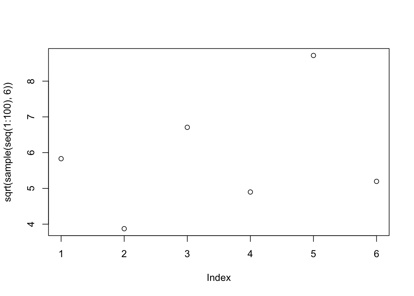 seq(1:100) %>% sample(6) %>% sqrt() %>% plot() # let's breathe