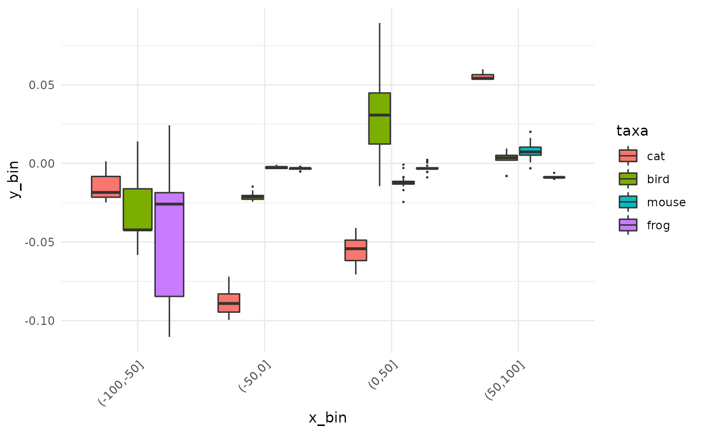 Whether you used the bin or fit pathway you have now slices of x (eg a factor) and y values5. We will call bacl animals_binned from above.